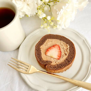 ココアスポンジに、いちごとショコラクリームを巻いたロールケーキです。 いちごの甘酸っぱさと、クリームのまろやかな甘さが相性バツグンですよ〜♡(#^.^#)😊