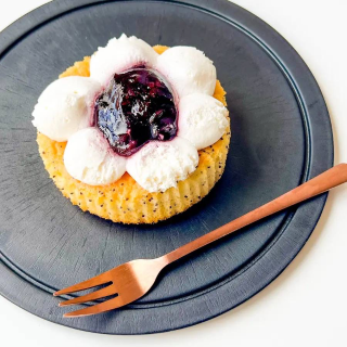 ブルーベリーソースを中央にたっぷりと乗せ、その周りをホイップで、お花模様に絞った華やかなビジュアルが綺麗ですね(’-’*)♪😀